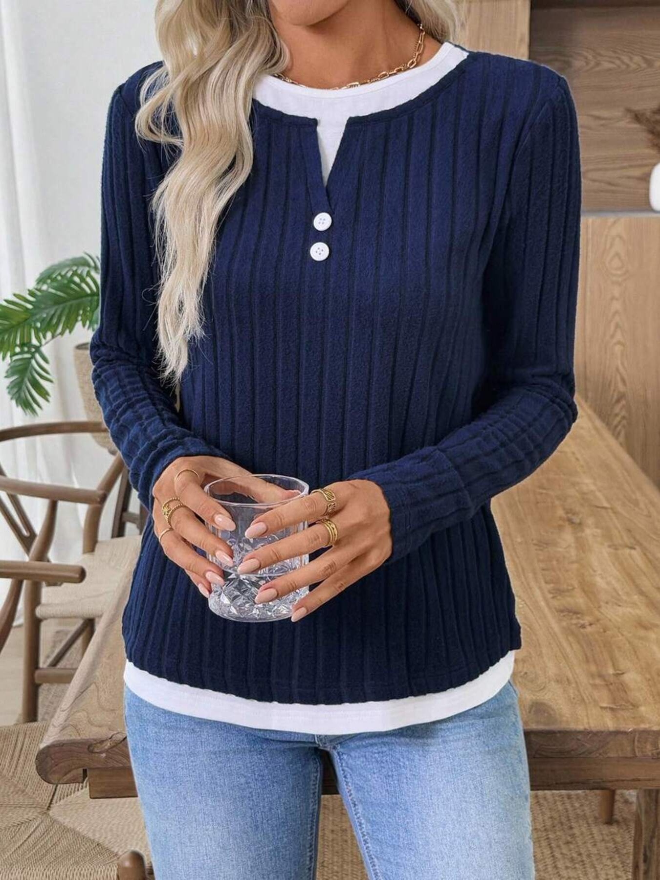 Ribbed Knit Button Detail Contrast Sweater