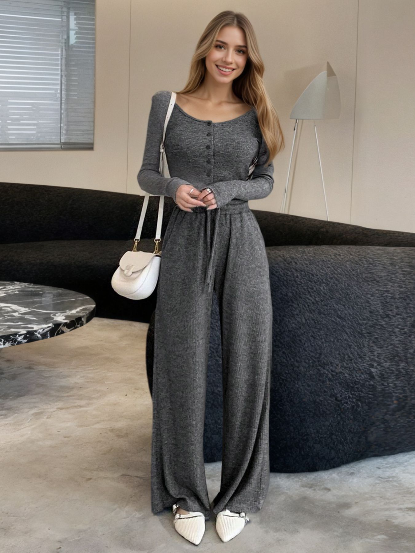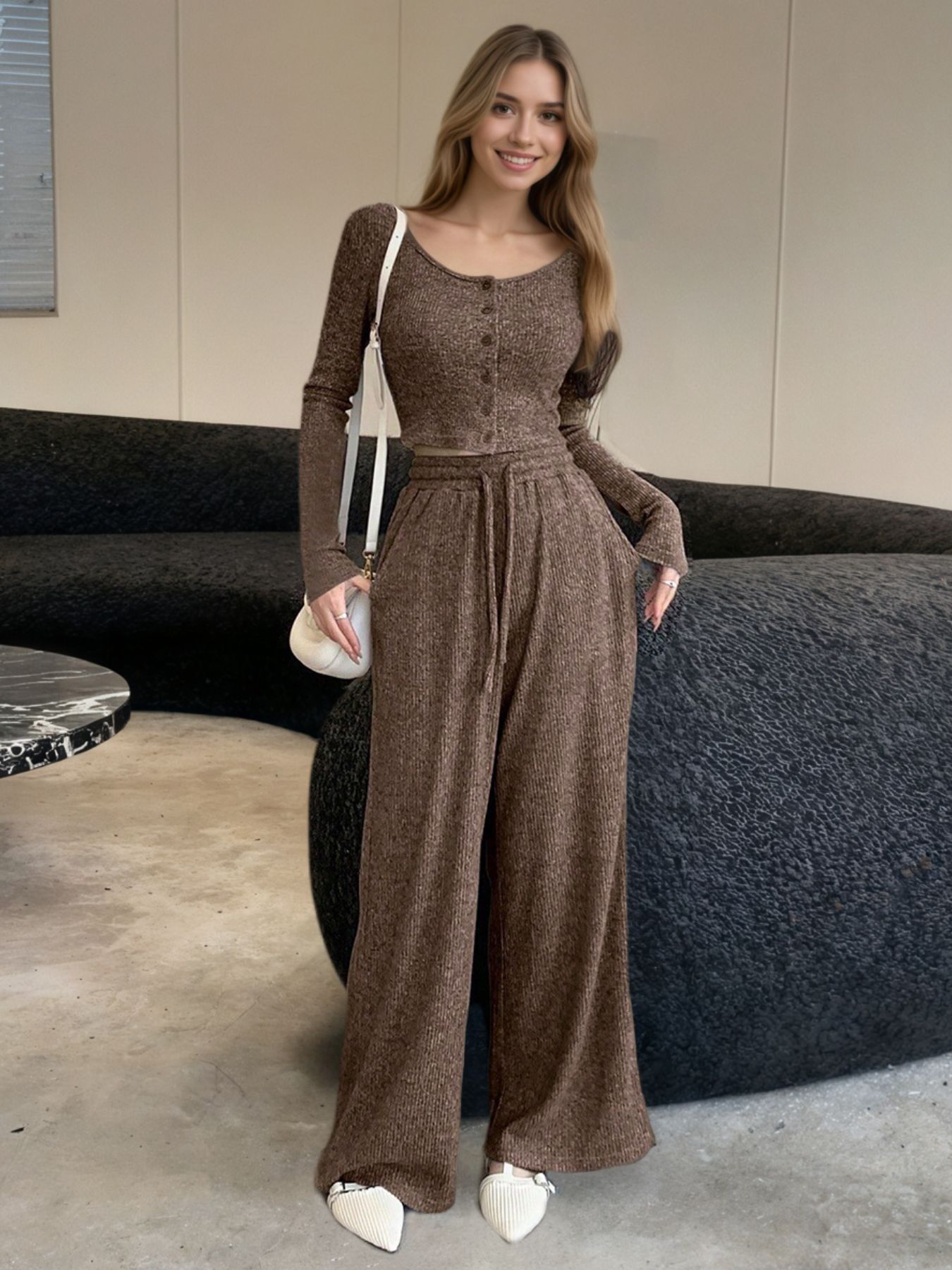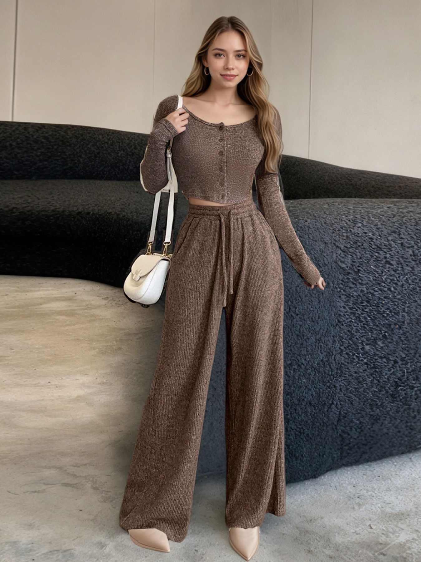 Casual Knit Long Sleeve Top And Wide Leg Pants Set