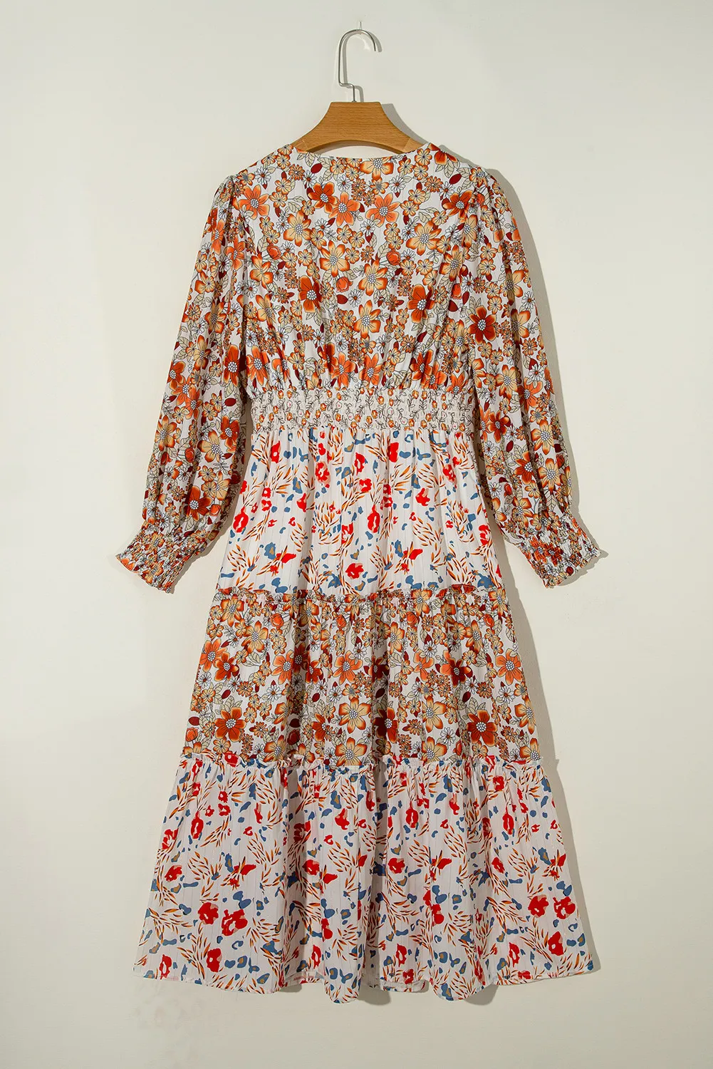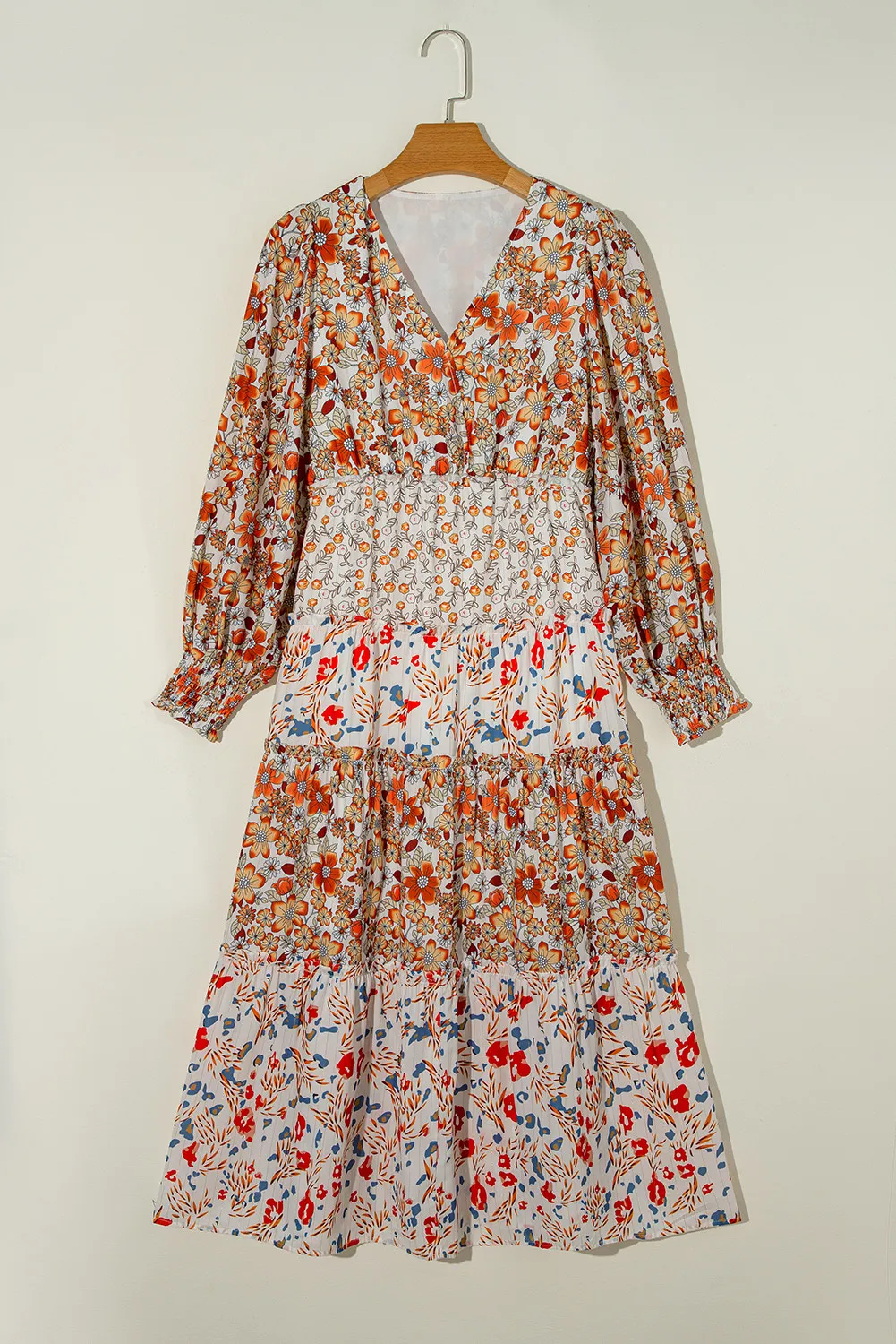 Full Size Printed V-Neck Lantern Sleeve Midi Dress